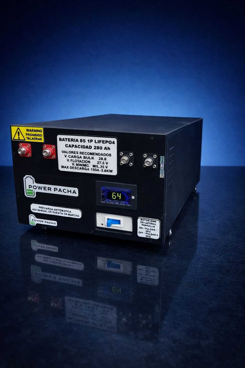 Su configuración 8S2P proporciona una tensión nominal de 25,6 V, ideal para sistemas de 24 V, con una elevada capacidad y estabilidad eléctrica. El conjunto integra un display digital para monitorización en tiempo real y un interruptor general de corte, que permite desconectar la batería de forma rápida y segura para tareas de mantenimiento o emergencia.