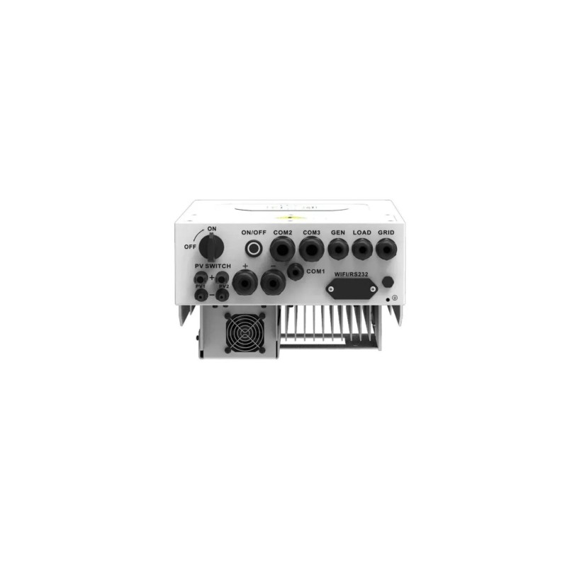 Este inversor destaca por su alta eficiencia, entradas MPPT duales para optimizar producción solar, y capacidad de operación en paralelo, lo que permite ampliar la potencia total del sistema si se instalan múltiples unidades.